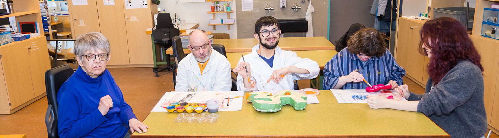In den vier Ateliers bieten wir den intern und extern wohnenden Mitarbeitenden mit Beeinträchtigung eine geregelte Tagesstruktur und vielseitige Arbeits- sowie Aktivitätenangebote mit individuellen Leistungsanforderungen. Dabei wird eine möglichst kompetente Teilhabe unter Berücksichtigung ihrer Fähigkeiten und Interessen ermöglicht. Gemeinsamer Austausch, Lachen und Entspannung haben ebenso Platz wie das konzentrierte Arbeiten an Produkten, kreative Tätigkeiten und Bewegung.