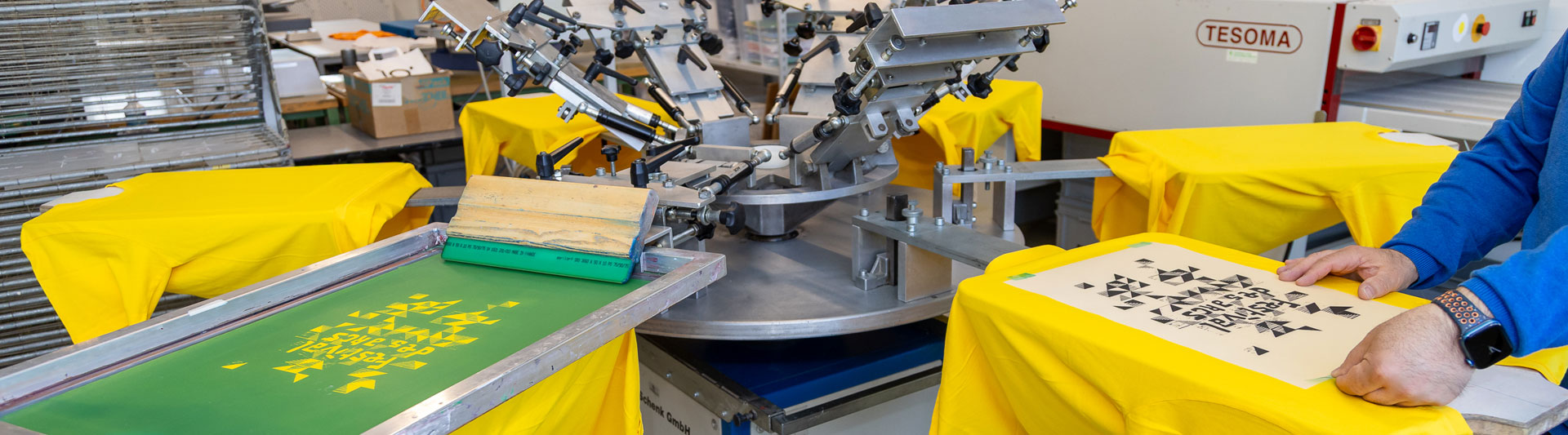 Die motivierten Mitarbeitenden mit Beeinträchtigung arbeiten an geschützten Arbeitsplätzen im vielseitigen Maschinenpark der arwo Stiftung Wettingen. Unter Anleitung von Fachpersonen bedrucken die Mitarbeitenden mit IV-Rente praktisch alle Textilien sowie schöne Weihnachts- und Glückwunschkarten im Digital- oder Siebdruckverfahren.